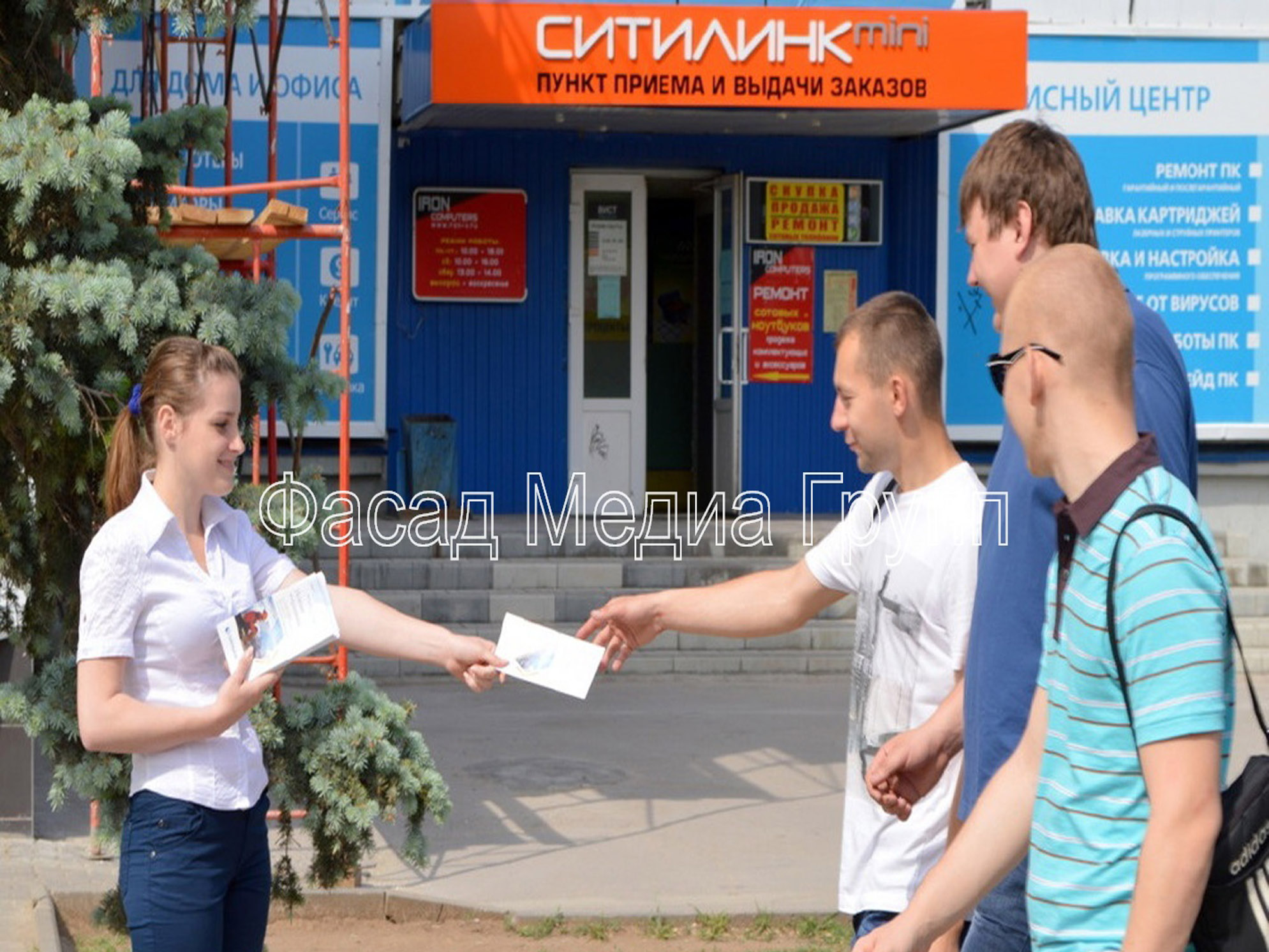 Проводя раздачу рекламных материалов на улицах города, вы сможете мгновенно охватить всех людей без исключения. В условиях городской среды раздача печатной рекламной продукции является эффективным средством продвижения бренда организации, поддержания внимания к вашему бизнесу, привлечения новых клиентов и удержания старых покупателей и заказчиков. Именно раздача визиток, листовок, буклетов, флаеров и т.д. на улицах города помогают горожанам получить необходимую рекламную информацию. Раздача печатной продукции способствует быстрому распространению рекламной информации, хорошей заметности рекламного материала, делают рекламную кампанию еще более эффективной, а бизнес прибыльным. Для раздачи листовок, визиток, флаеров на улицах города обращайтесь в рекламное агентство «Фасад Медиа Групп». Будем рады сотрудничеству.