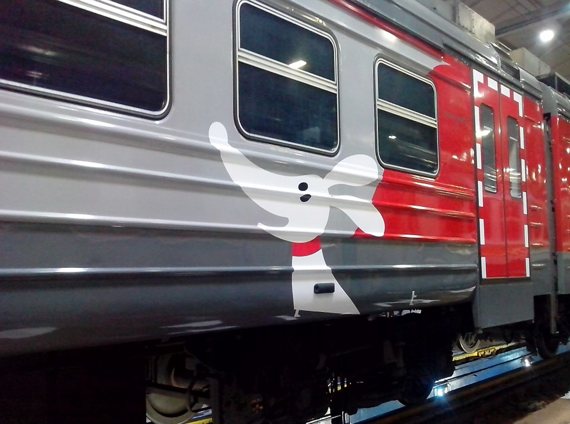 Пример брендирования электричек самоклеящейся пленкой представлен на фото: