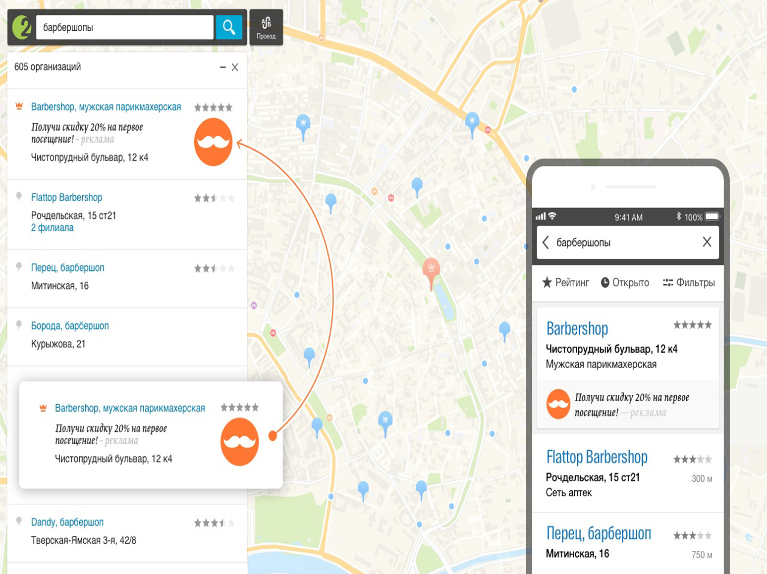 В 2ГИС (Двагис, ДубльГис) доступна геореклама – контекстная и медийная реклама, которую видит пользователь с учетом географии его интересов или текущего местоположения.